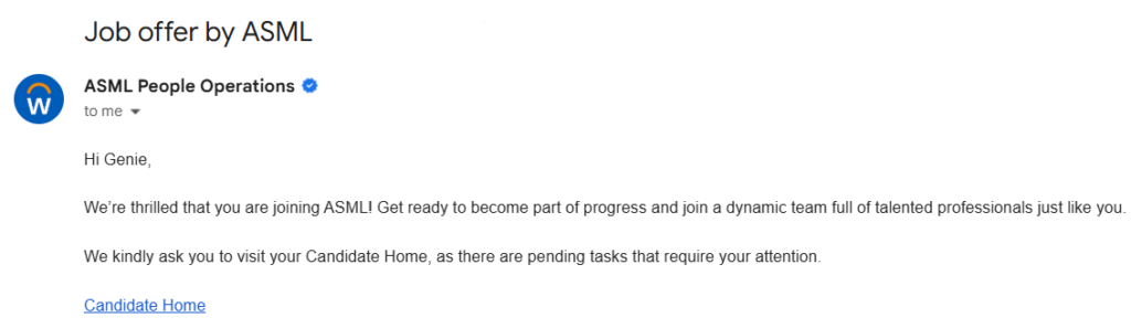 題外話,除了 ASML 之外,我也投遞了其他公司,不過我特別喜歡 ASML 的地方是,每次面試完,HR會特地回電關心剛剛的面試狀況,在這時我也會進一步詢問是否能提點我當次面試的 feedback 以及下次可以著重的面向,而HR 同仁總是很專業、耐心、有條理地回覆我,我會記錄下這些回覆並且在下次面試時派上用場,很有幫助!此外,他們會詢問我對於招募流程和面試過程的建議、想法和感受,整個流程結束後有回饋表單可以填,能深刻感覺到想法超級被重視,從官網呈現、洽談過程、Feedback交換,每個環節都很用心並展現出一致的品牌價值,感覺每位 candidate都是經過透徹瞭解後精挑細選出來的,我很榮幸也期待能在這樣的公司工作,加油加油;)